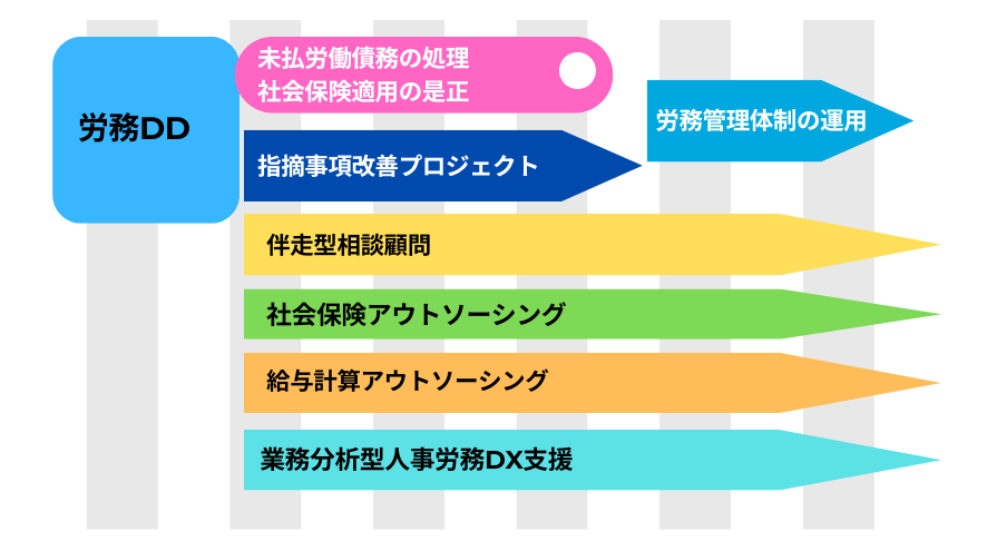 労務DD報告書に基づき、具体的な改善策の実行を伴走支援いたします(別途費用)。